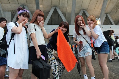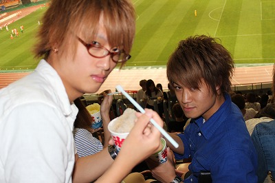 スタジアムで販売している「焼きそば」や「ポテト」などを食べ、そしてジュースなども飲みながら応援しています。
