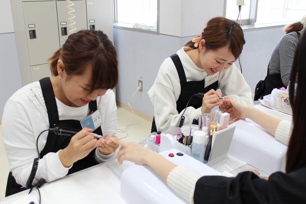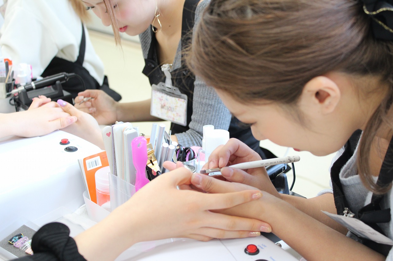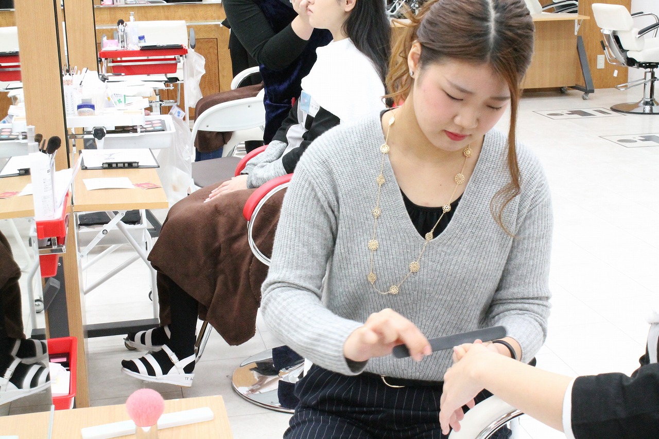 トータルエステティック学科の学生に普段自分たちが学んでいるメイク、ネイルを施術します。