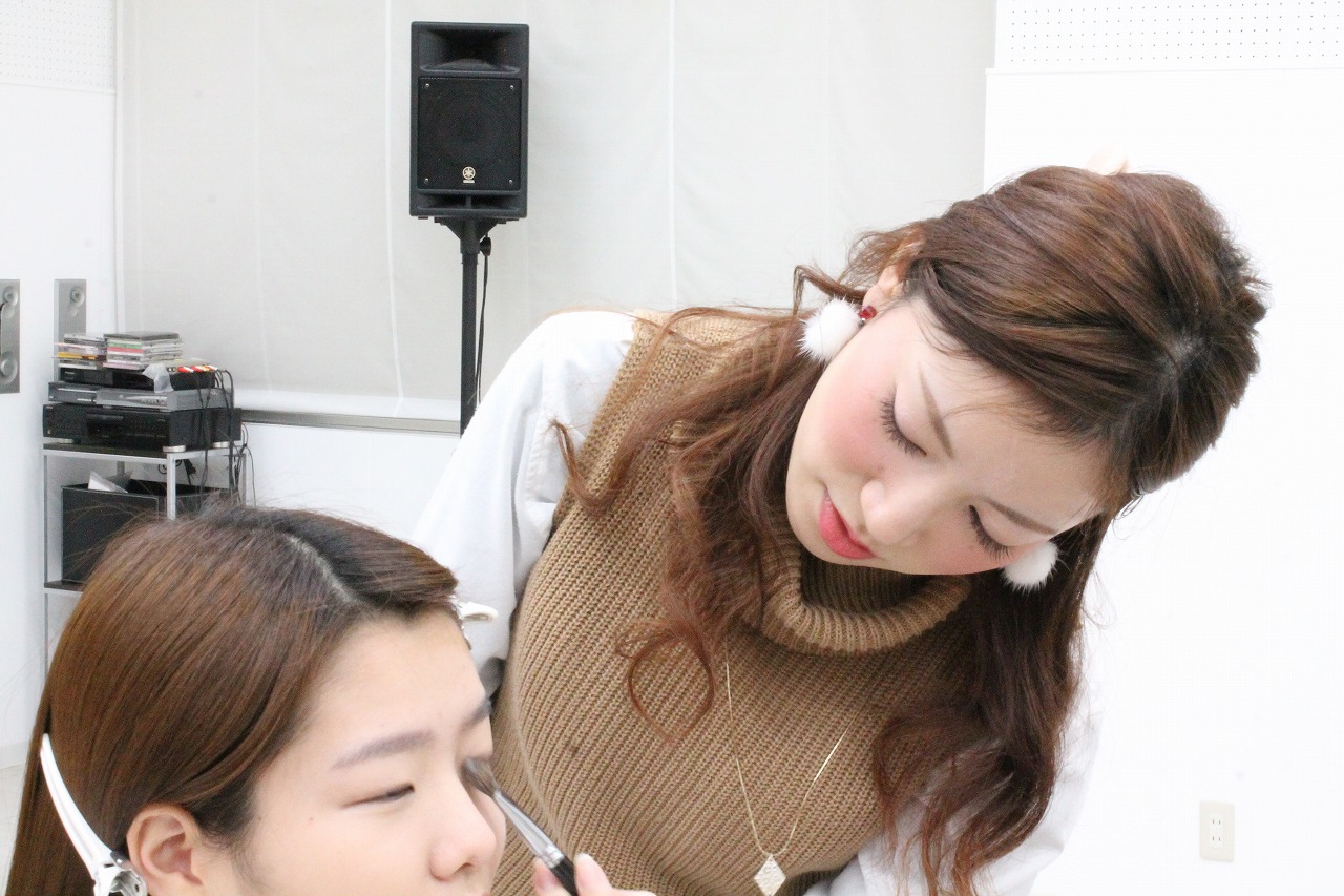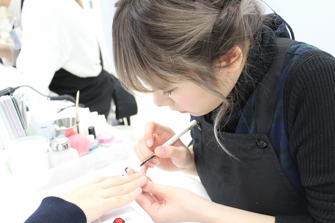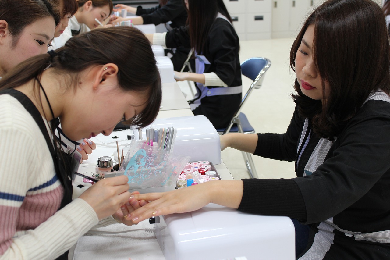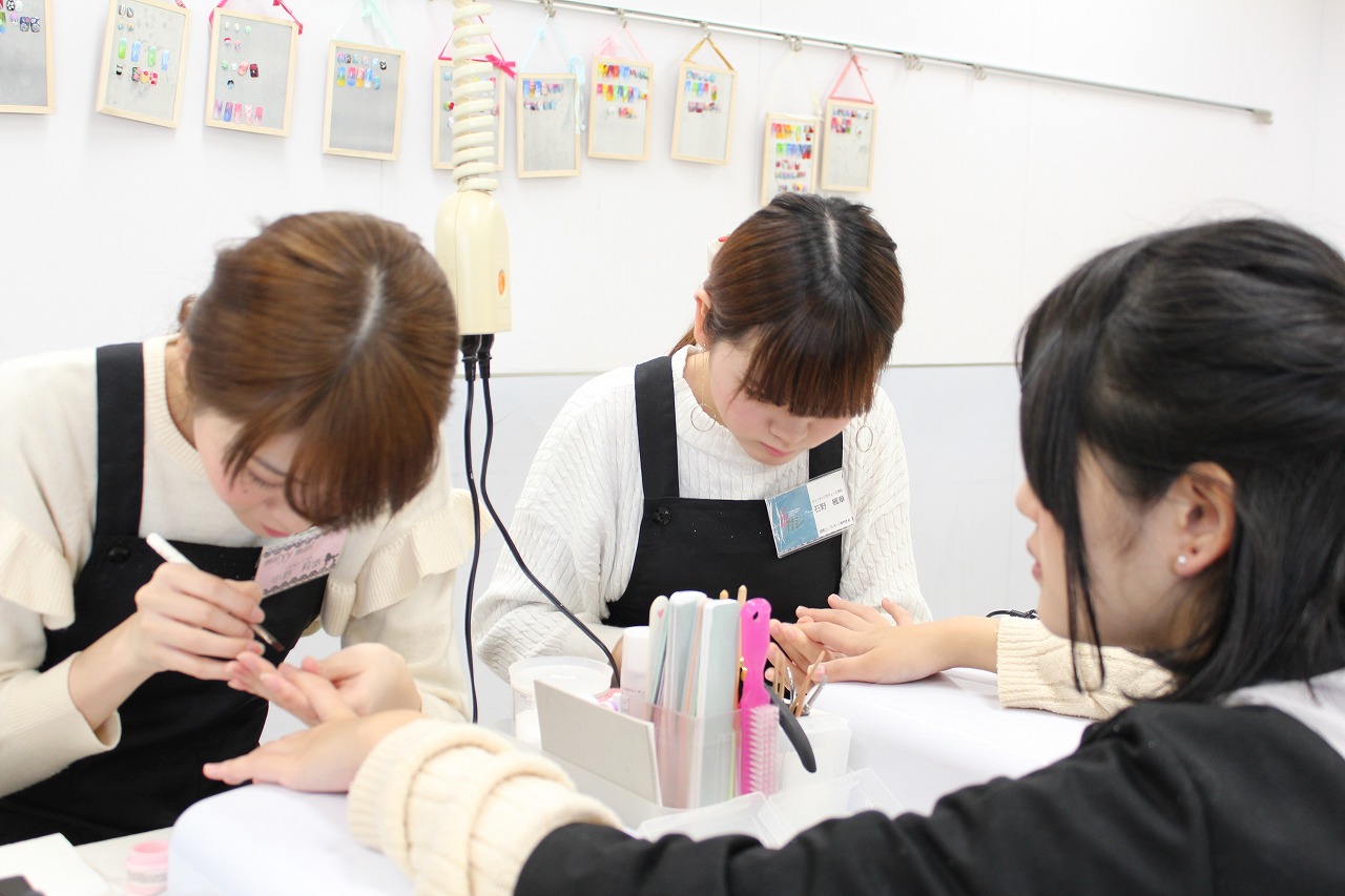 トータルエステティック学科の学生に普段自分たちが学んでいるメイク、ネイルを施術します。