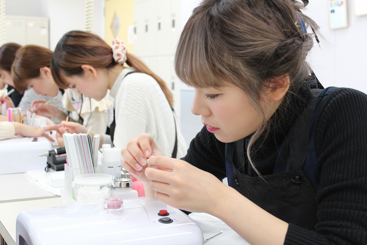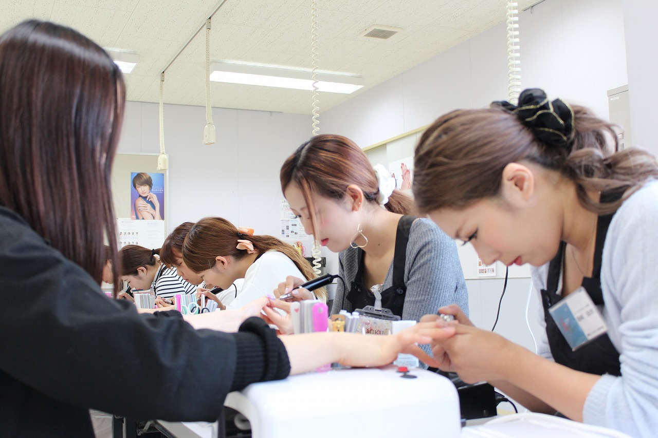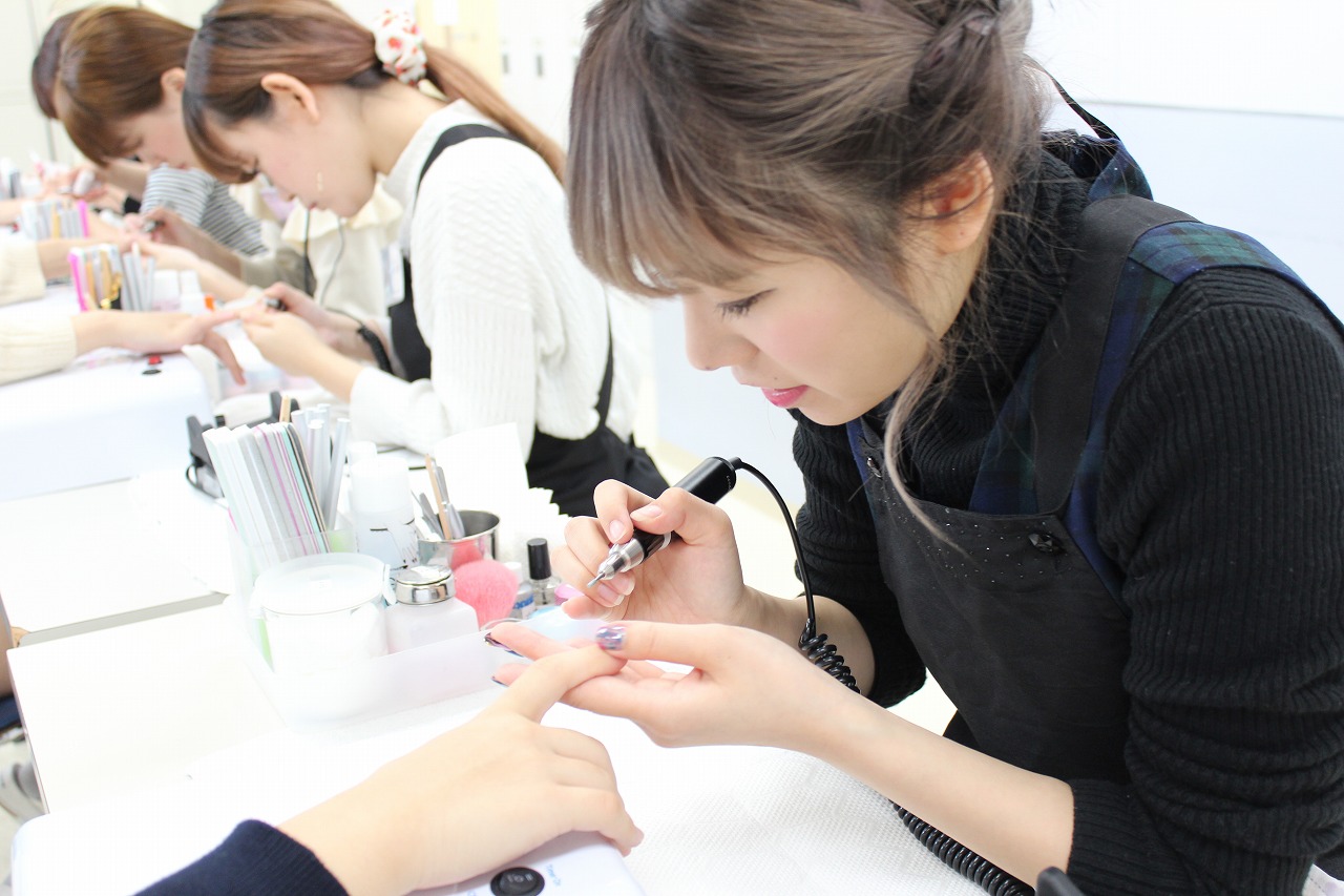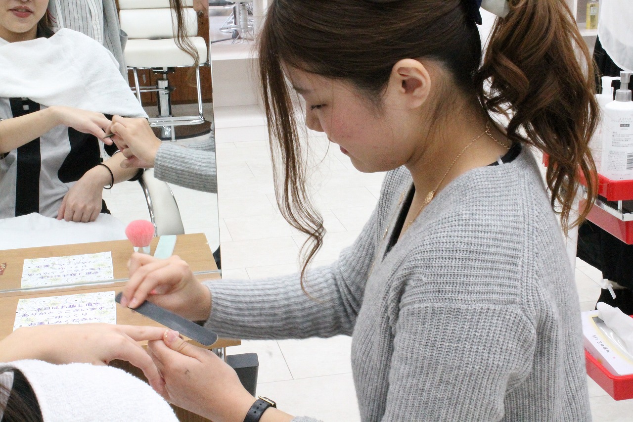 メイク施術中の学生に、爪のお手入れをしたり・・・