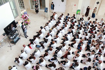 今日は、避難訓練も行われました。広いアトリウムに新入生が全員集合!