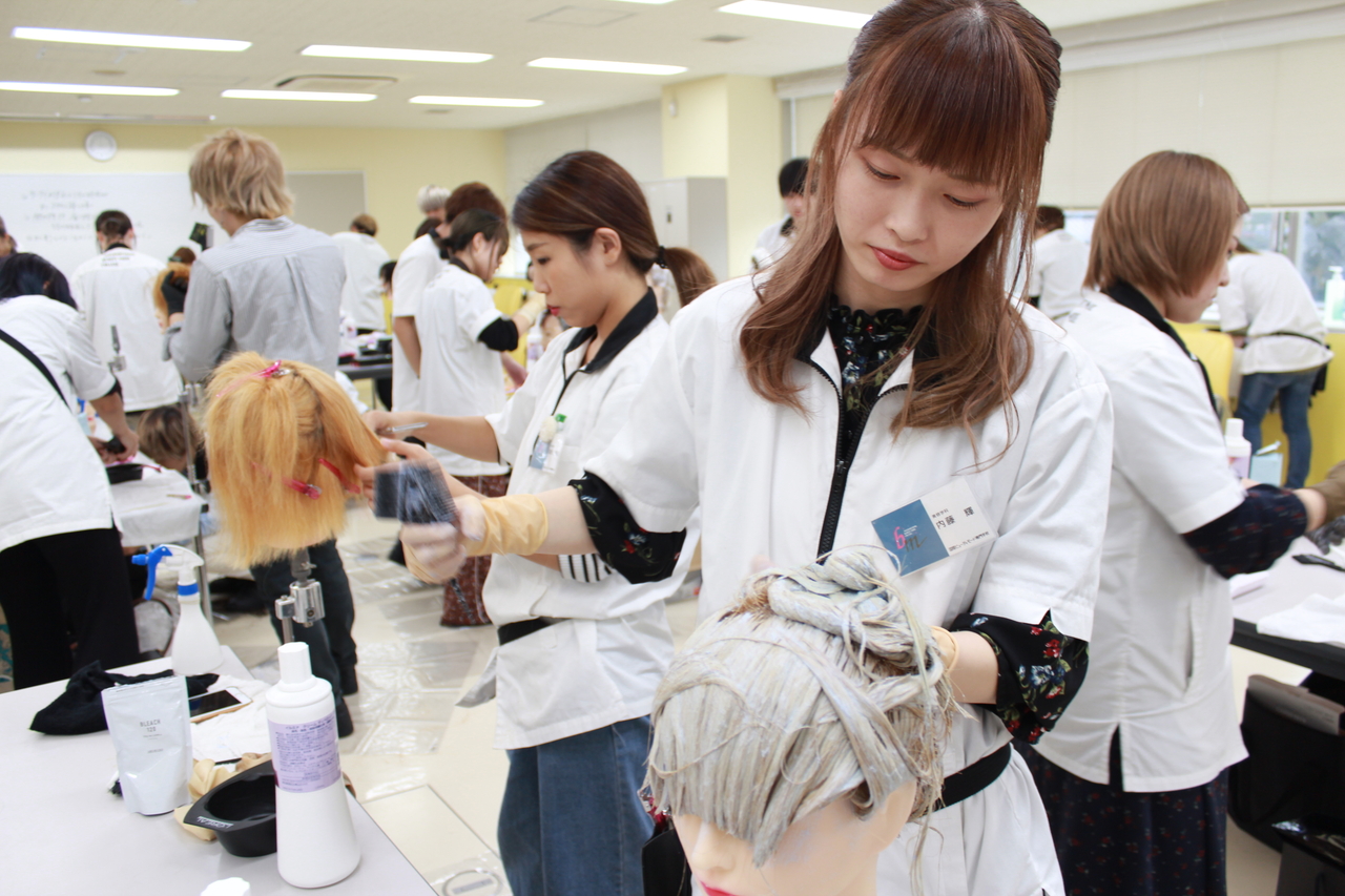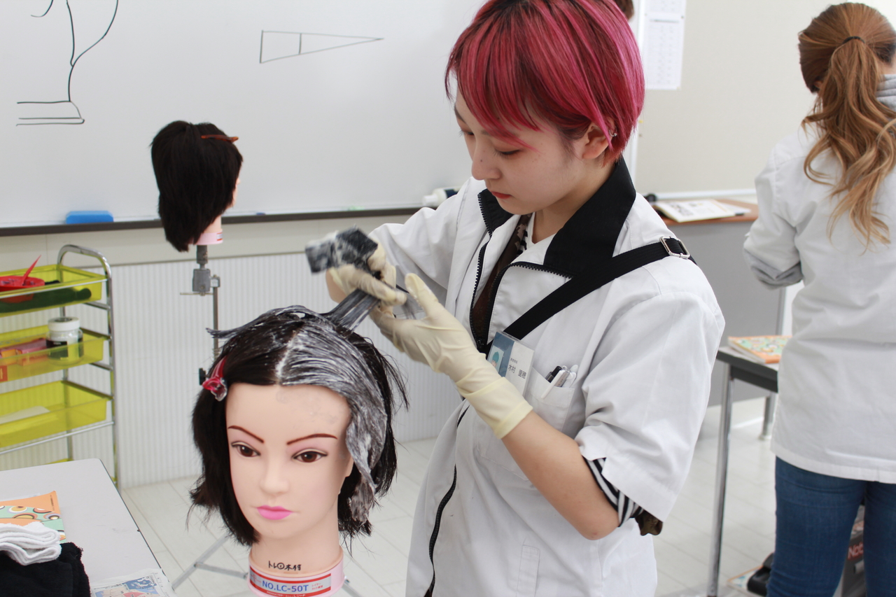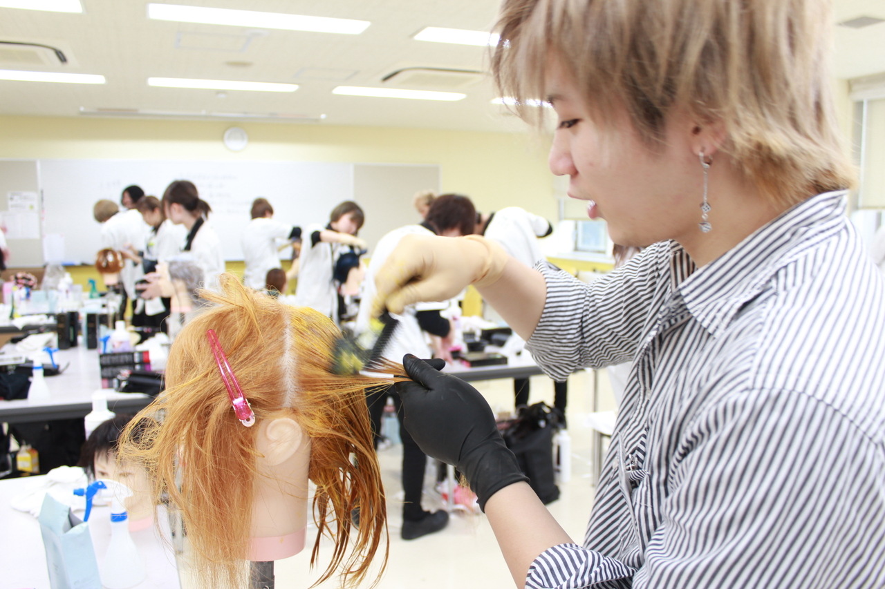 この日のヘアデザイン専攻はカラーでした。既に自分がしたいスタイルにカットしたウィッグにカラーを施しています。