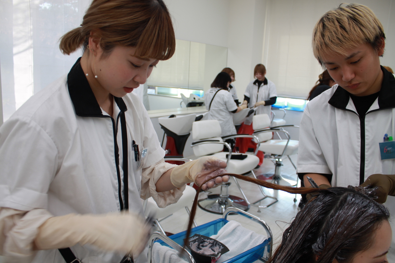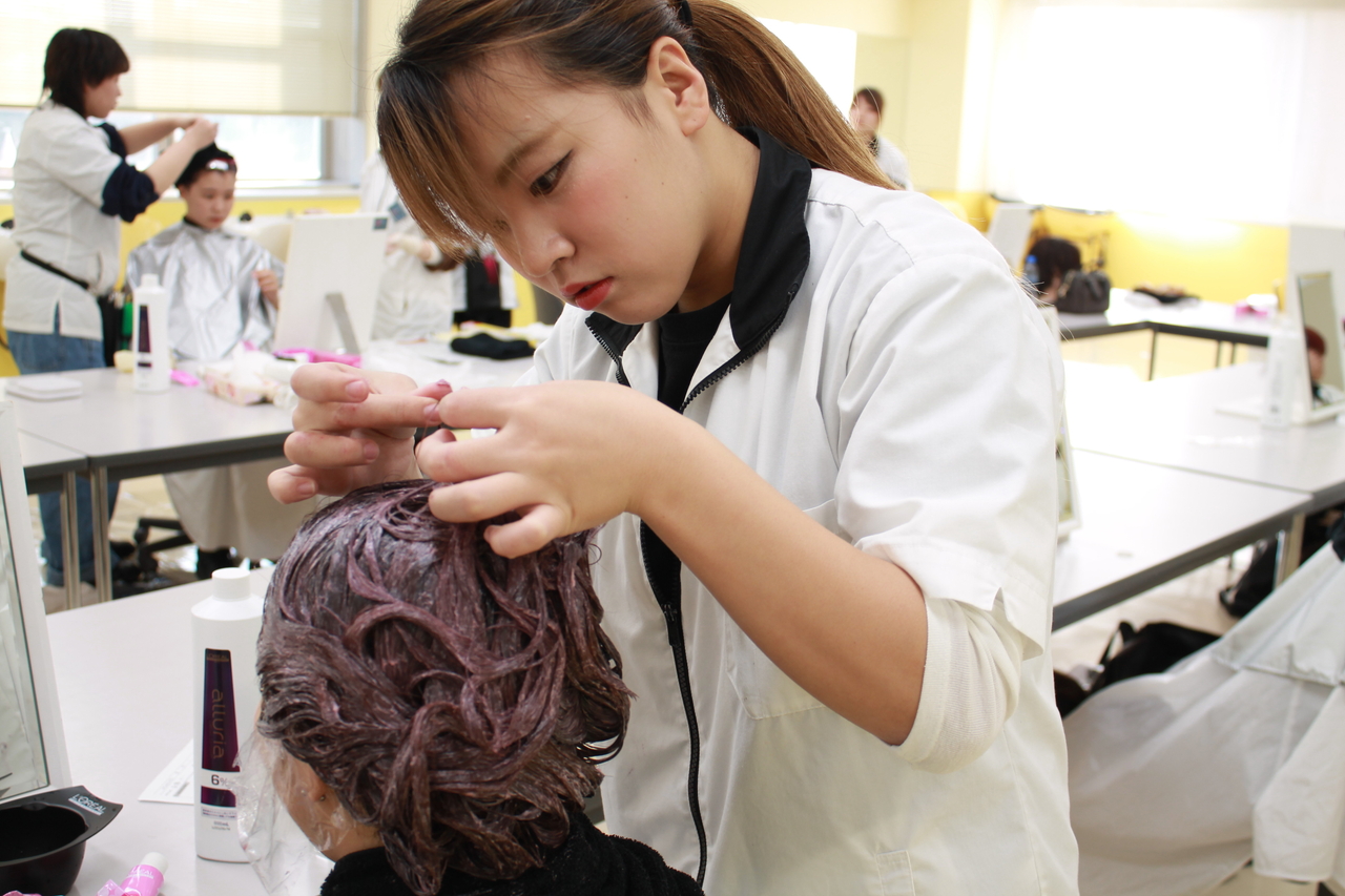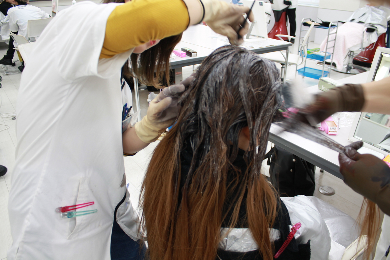 この日は、事前に学生同士でカウンセリングをし、決めていたカラー剤で実際に染めていました。