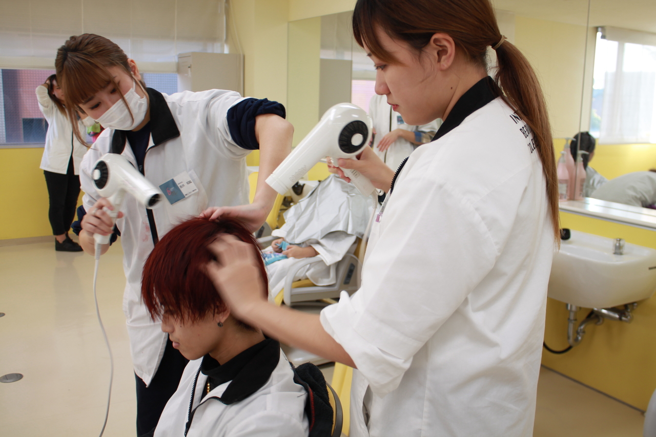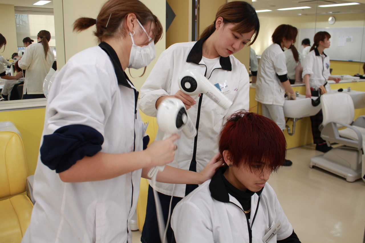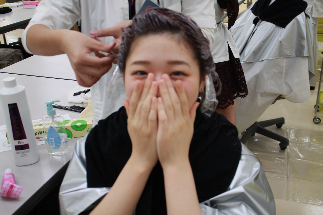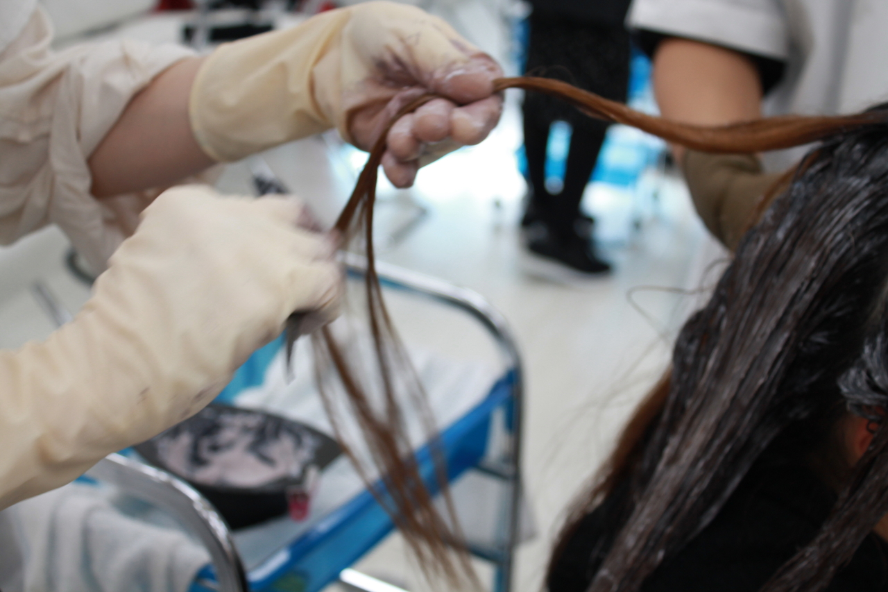 この日は、事前に学生同士でカウンセリングをし、決めていたカラー剤で実際に染めていました。