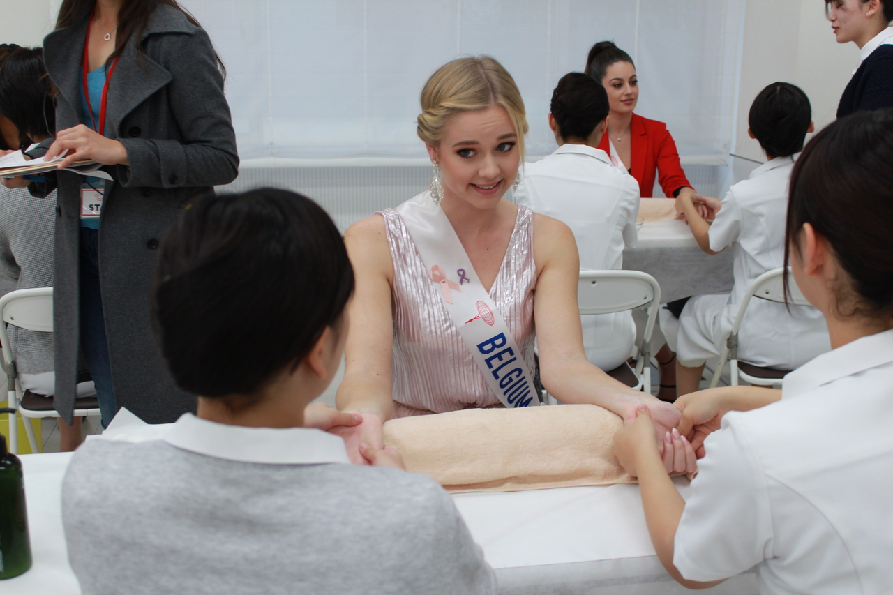 今回、BMでのおもてなしは、トータルエステティック学科の学生がハンドエステ、美容学科の学生が浴衣の着付けと、