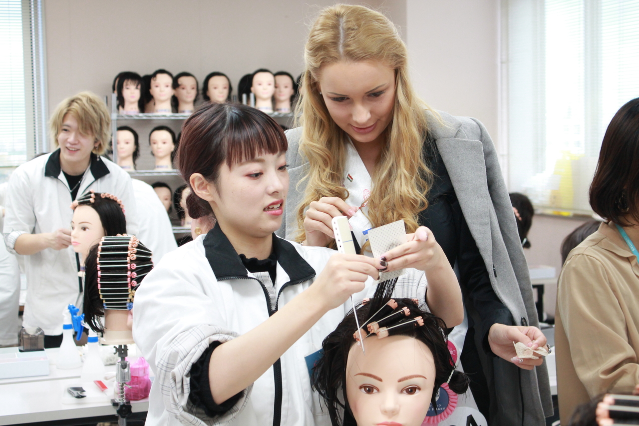 パーマ巻きの体験授業を行いました。