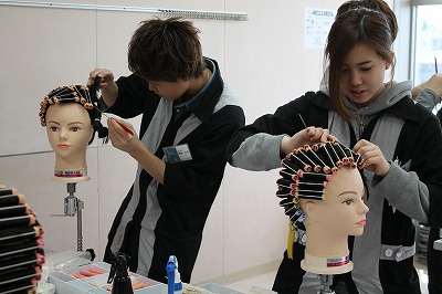 シャンプーとワインディングの授業を見学した中学生たち。