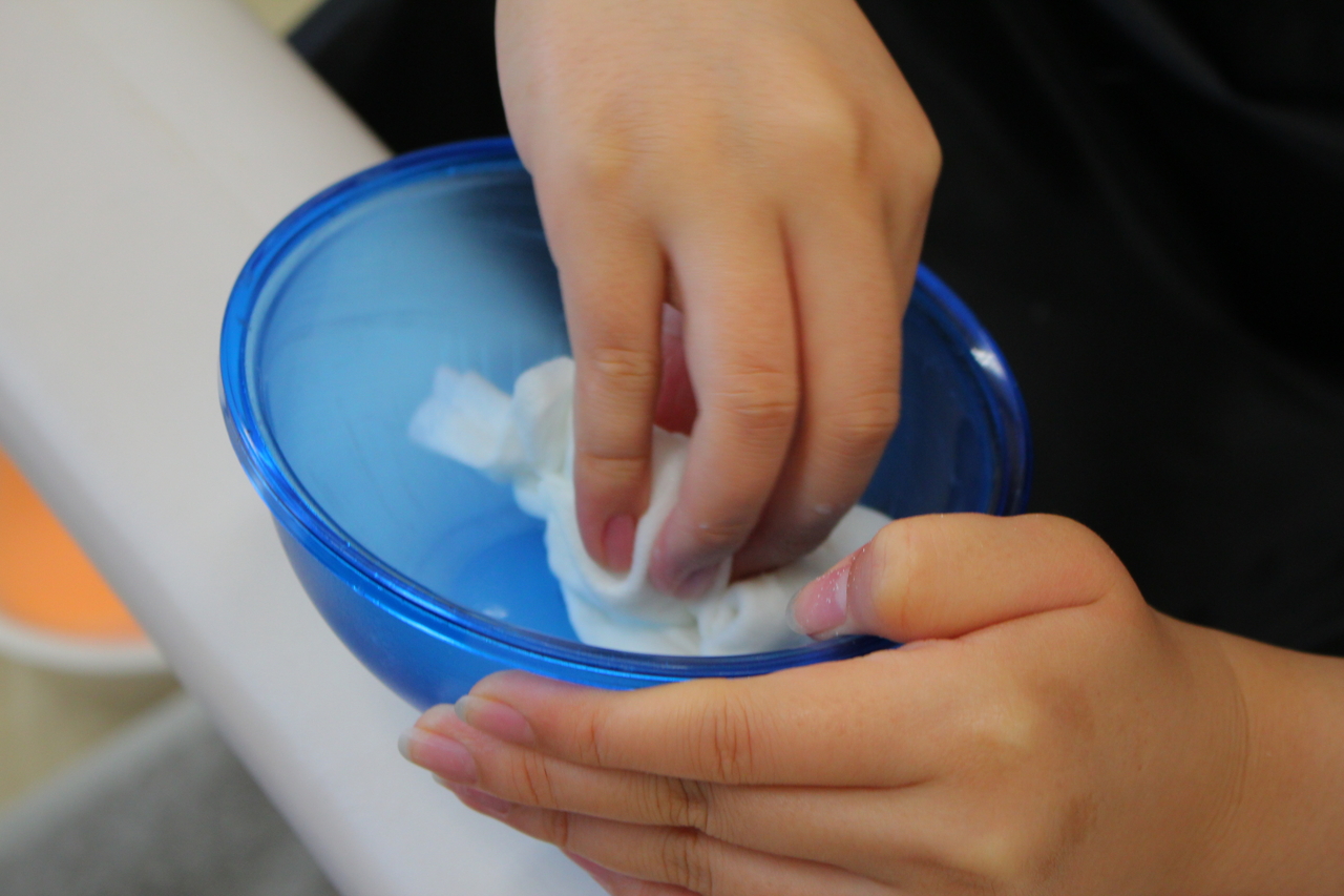 まずは、先生のデモを見てからの実践です。 このフットケア授業、フットバスを使用しなくても角質除去ができ、