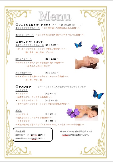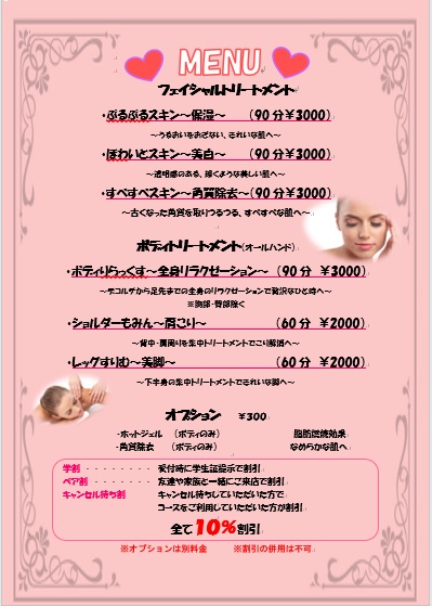 当校の在校生がエステの施術を低価格で提供するという内容になっています。