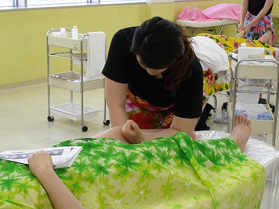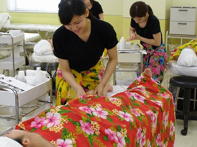 施術している学生も楽しそうですが、ロミロミをしてもらっている学生達、気持ち良さそうですね。