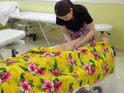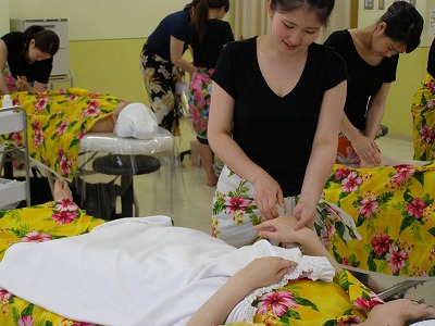 トータルエステティック学科の「ロミロミ」の授業の様子です。