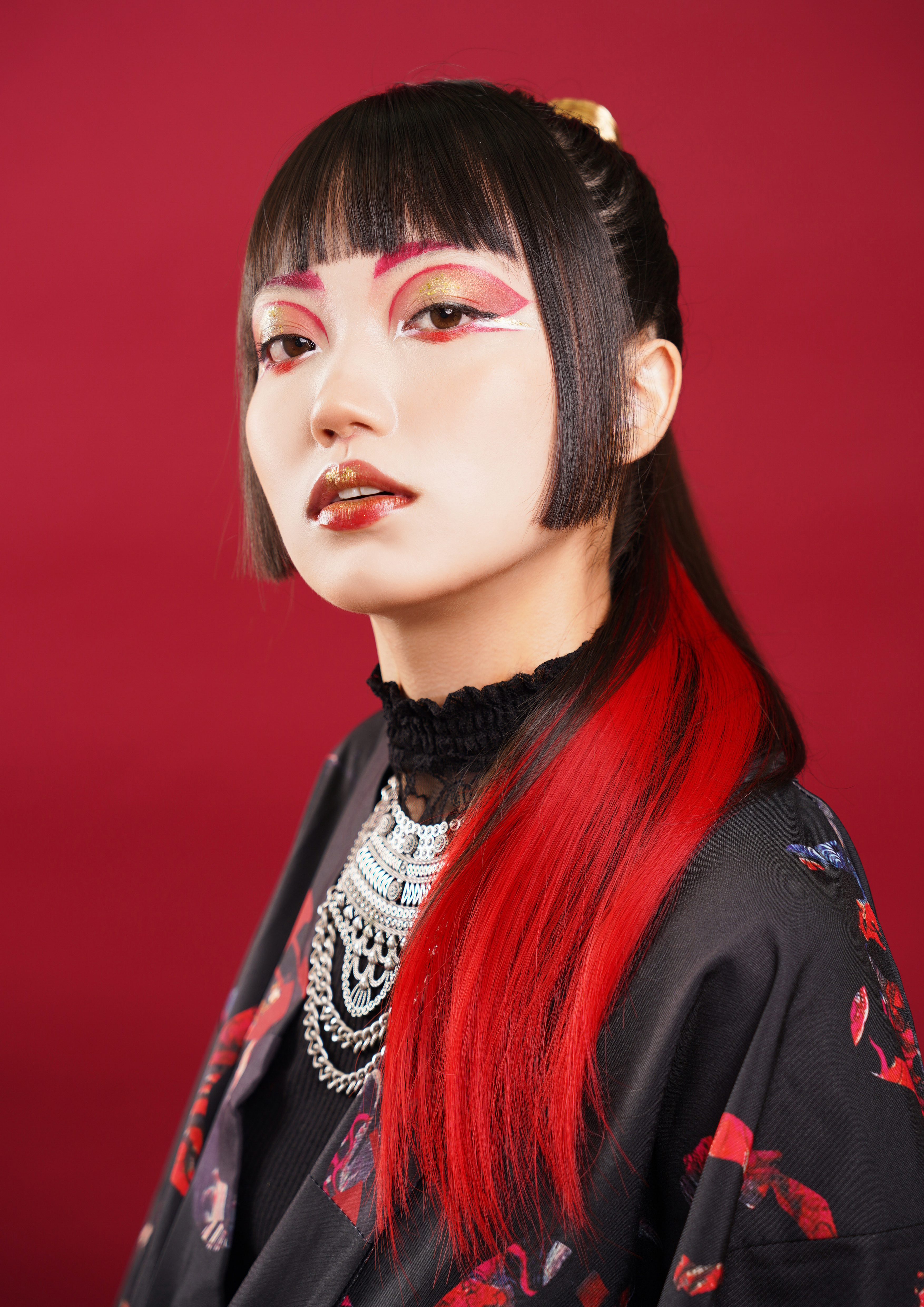 赤とゴールドを惜しみなく使い、重たくなりすぎないように顔の下部分はあえてシンプルに仕上げました!